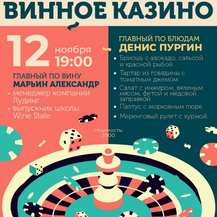 В программе — дегустация, неповторимые блюда от шефа, азарт, сюрпризы и, конечно, игра в винное казино!