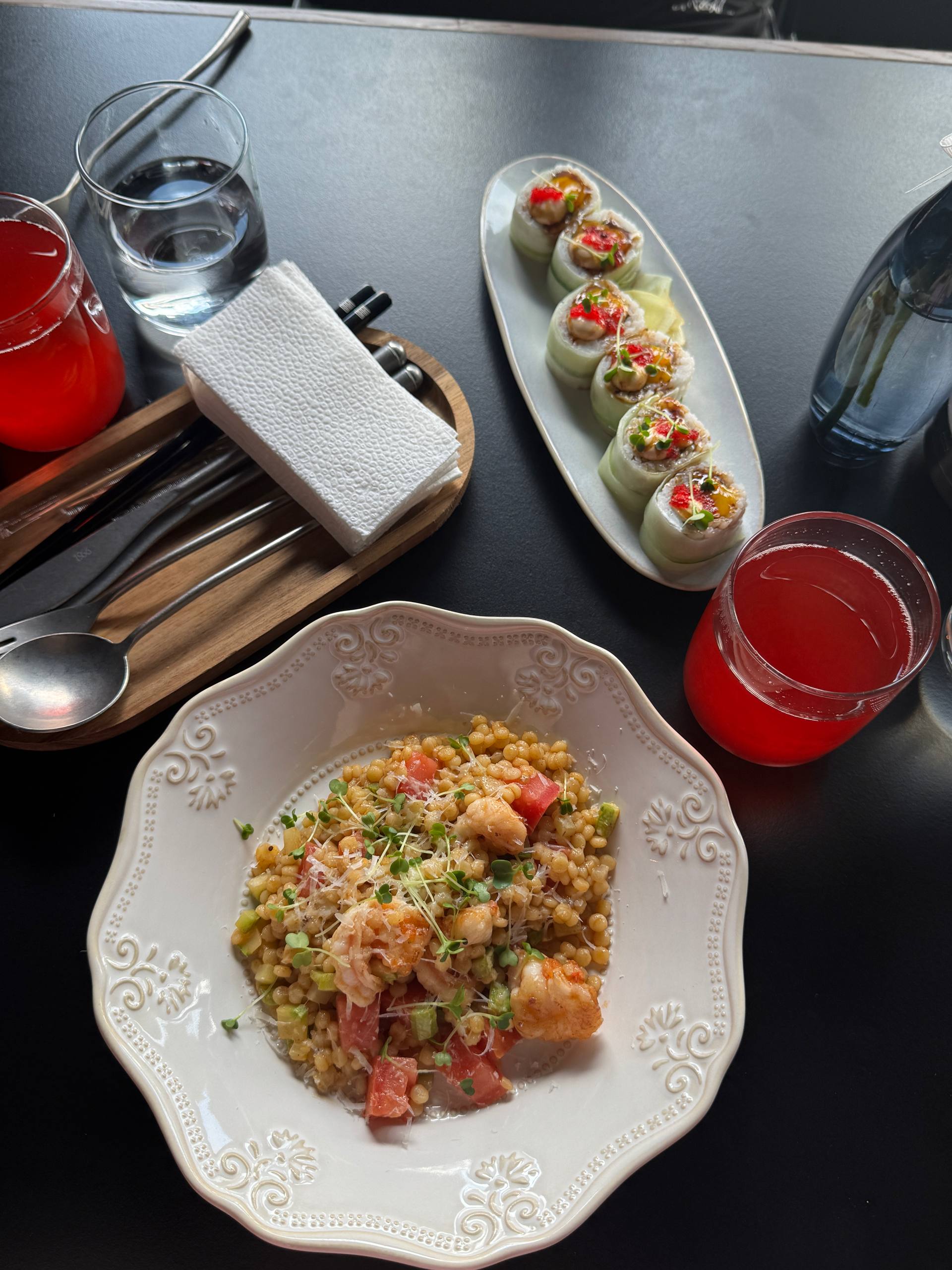 Нас очень впечатлил новый ресторан Drops. Давно не встречали такого креативного, умелого, а главное вкусного слияния восточной и европейской кухни. Советую попробовать их необычные закуски - мини-тарталетка с угрем и сливочным соусом и такояки с итальянским сыром и икрой палтуса. Плюсом также идёт красивая подача блюд.