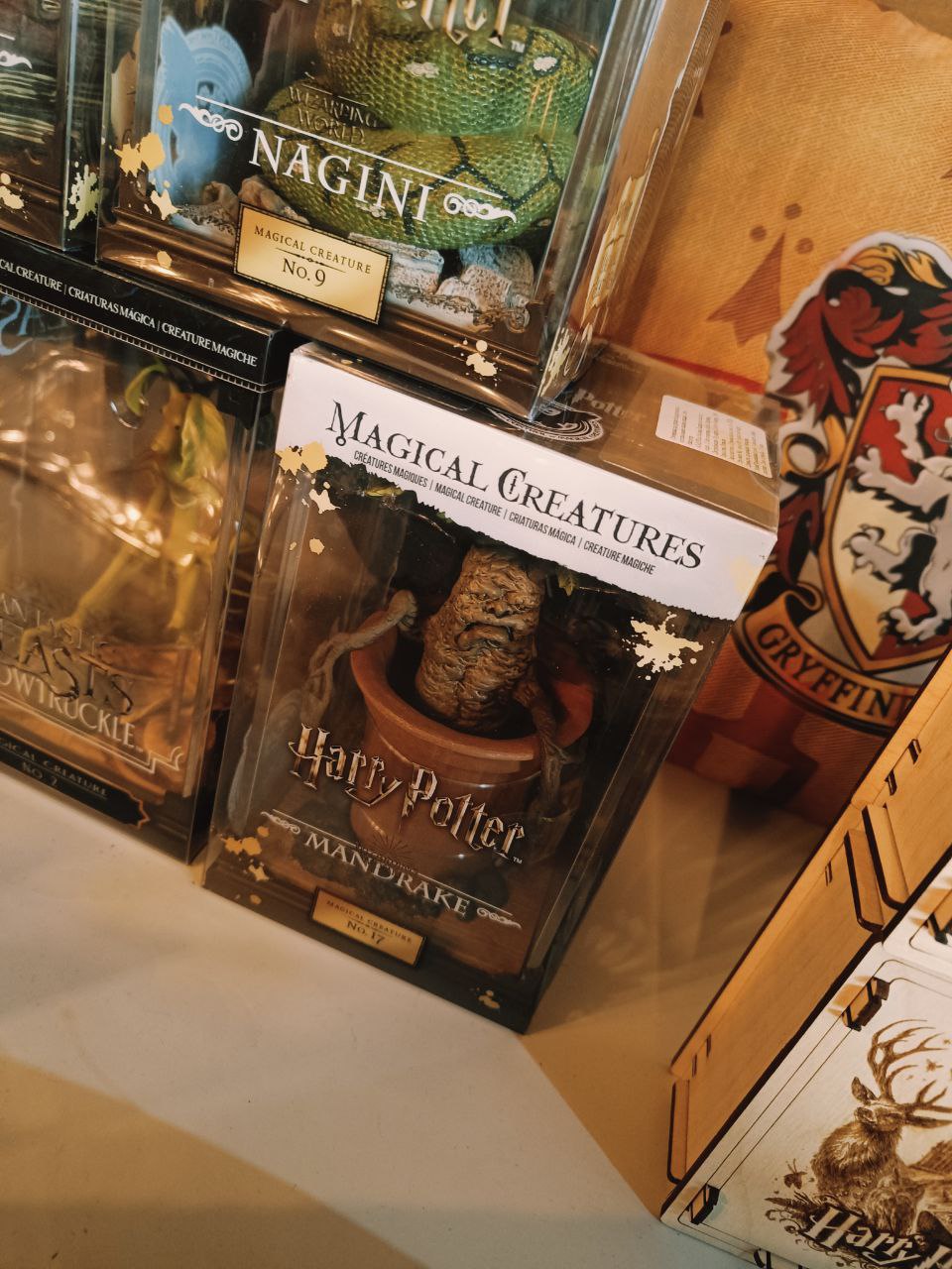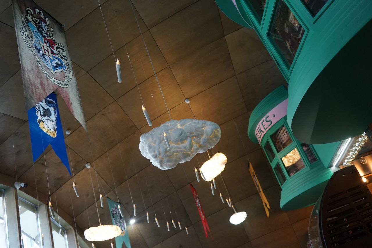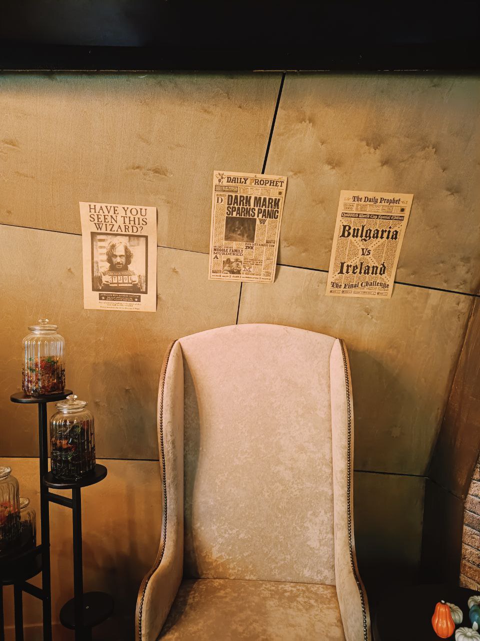 Внутри висят портреты, флаги факультетов, есть зона, где можно примерить форму и шляпы для красочных фотографий. Очень уютно, тепло, играет музыка из фильмов.
