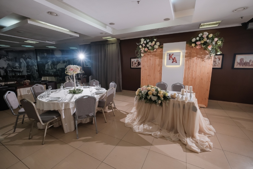 Банкетный зал отеля выполнен в классическом стиле, создающим атмосферу легкости и элегантности, способную удовлетворить даже самых взыскательных гостей. А лаконичный интерьер легко подстраивается под любые задумки декораторов. А лаконичный интерьер легко подстраивается под любые задумки декораторов.