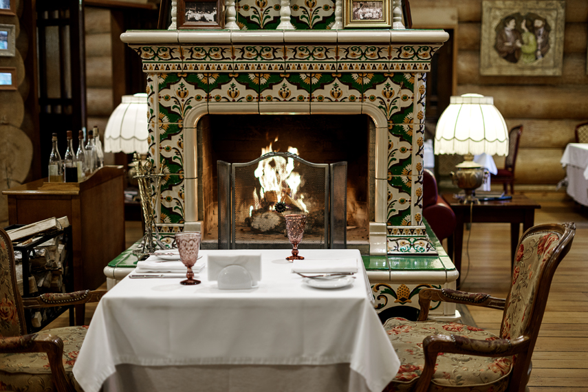 Несколько залов ресторана, а также отдельно расположенный банкетный зал, - единственный в своем роде архитектурный ансамбль в Новосибирске, передающий в полной мере атмосферу загородной усадьбы XIX века, выполнен из цельных сосновых бревен со старинным камином в центре зала.