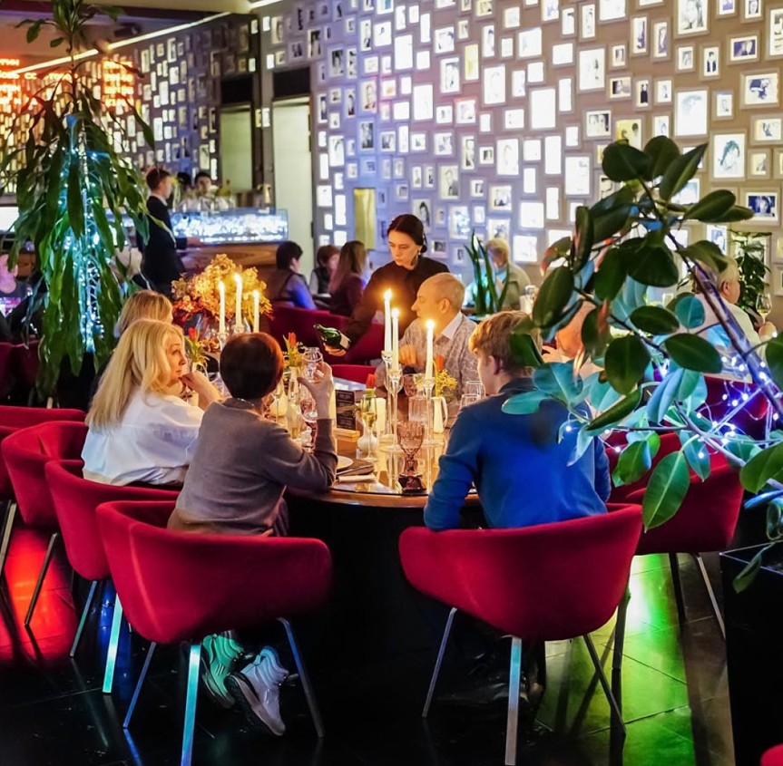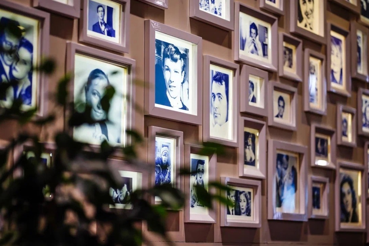 Особый шарм помещению придает серый зеркальный пол. Но главным украшением кафе «Премьера» является уникальная экспозиция фотографий кинозвезд ХХ-ХХI веков.
