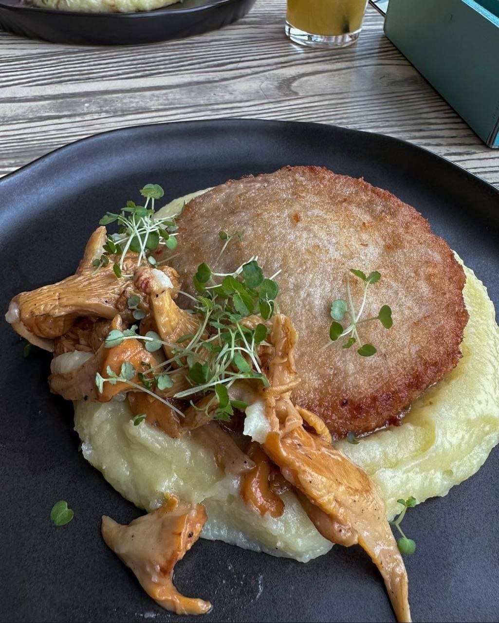 Очень советую попробовать котлету из птицы со свежими лисичками в соусе демиглас - (куриная котлета в хрустящей панировке подается со сливочным картофельным пюре и лисичками).