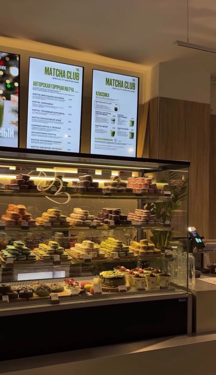 Здесь матча мания, обширный выбор зеленой кружки с разнообразными вкусами и добавками, а также завтраки и богатая десертная витрина.