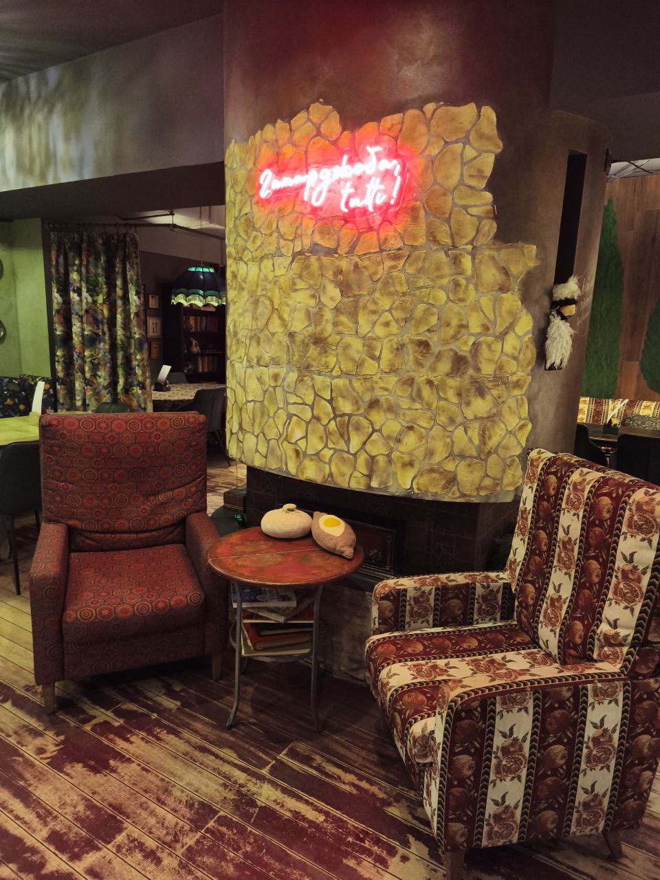 Интерьер очень теплый и домашний. Невероятно много деталей, которые хочется разглядывать и потрогать (шторы, абажур, кресла, что сейчас считается "пылесборником"). Создаётся ощущение, что ты действительно дома у невероятно добрых и хлебосольных родственников, атмосфера разговоров на кухне (как в детстве у бабушки).