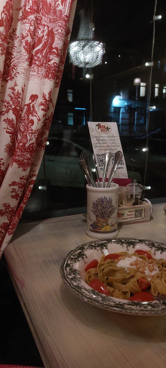 Вах, какое песто. Ядринцевская, 14 (свернуть с Красного проспекта на Ядринцевскую и по идти по правой стороне. У ресторана большие окна в пол с гирляндами — мимо не пройдёте).
