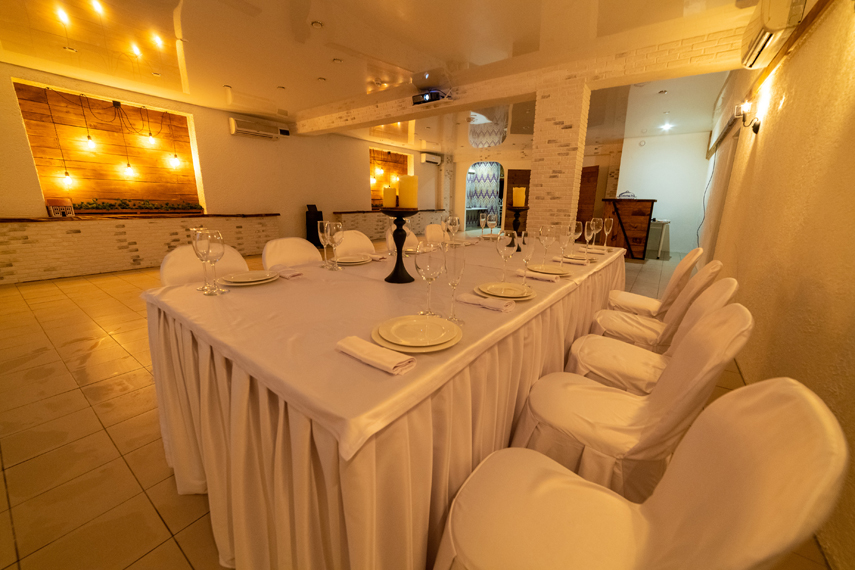 Для вас: несколько вариантов рассадки гостей для комфортного размещения,возможность принести свои напитки, торт, фрукты, чай / кофе, оформление по согласованию с заказчиком: текстиль, живые или искусственные цветы, воздушные шары (несколько цветов на выбор), разнобразное банкетное меню, в котором заказ на человека включает около одного килограмма еды, профессиональное музыкальное и световое оборудование.
