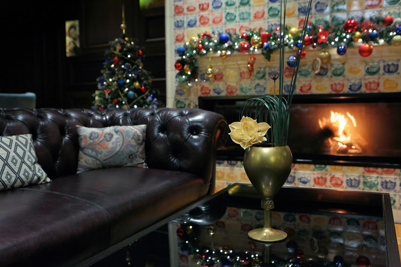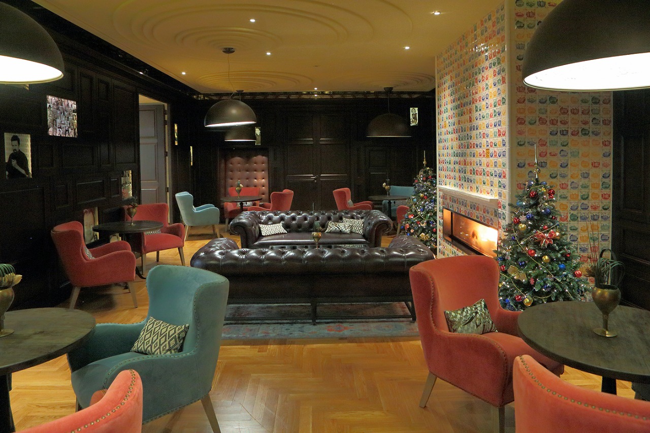 Настенные панно из тёмного дерева, английские диваны, опускающиеся с потолка итальянские люстры и дровяной камин, украшенный плиткой с обликами здания «Победы». В таком месте хочется проводить вечера за общением с друзьями и наслаждаться аперитивом перед ужином.