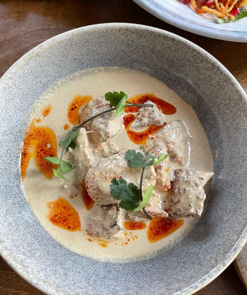 Чашушули из говядины с овощами и специями - интересное блюдо, немного островато. И об этом, кстати, не предупреждают, что странно. Тем, кто не любит острое - не рекомендую. Интересна подача - горшочек с запеченной сверху шапочкой из теста.