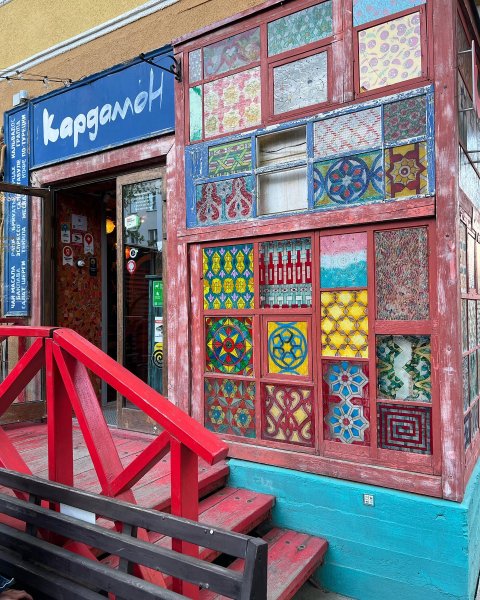 Дерево, резные двери, яркие цвета, внутри приглушённый свет, разные ароматы - это все круглый год в самом заведении.