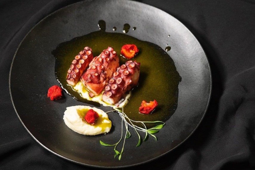 Осьминог с пюре из сельдерея и соусом на основе мёда и Совиньон Блан в обновлённой подаче. Прекрасен. Мы добиваемся безупречной мягкости и вкуса моллюска, готовя его особым сложносочинённым образом.