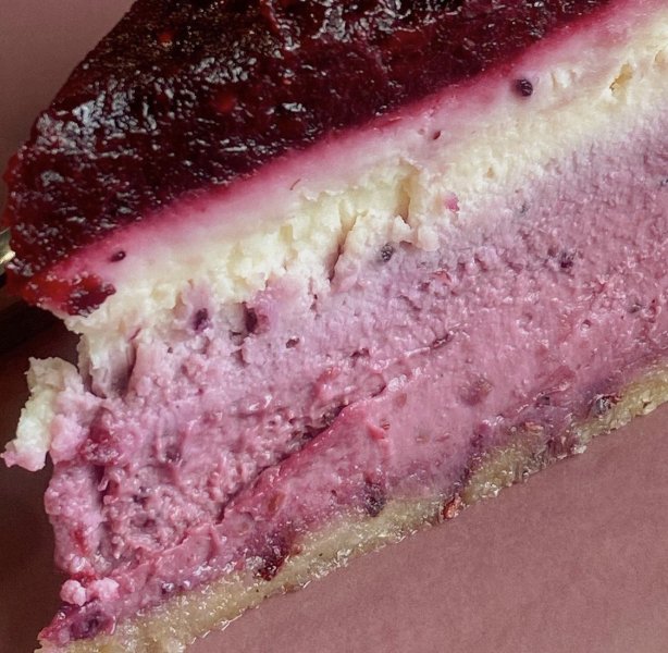 Свежая и, что важно, вкусная клубника и голубика сверху. Корж такой приятный по твердости. Сами ягодные слои, ну очень нежные. Десерт в меру сладкий, и, кажется, в чизкейк добавили всю ягоду, которая имеется. Да и сама порция нормального размера, не жадничают.