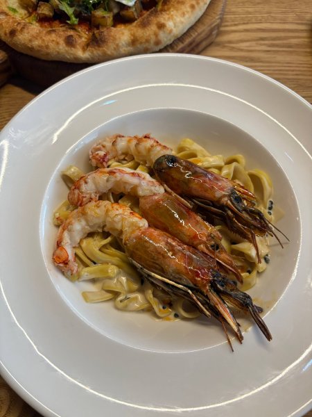 Простое и понятное, можно сказать беспроигрышное сочетание пасты фетучини с сливочным соусом и креветками. Толи в соус добавляют биск, толи это от обжаренной головы креветки но соус содержит приятные хитиновые ноты, а само мясо по вкусу ближе к раковым шейкам даже.