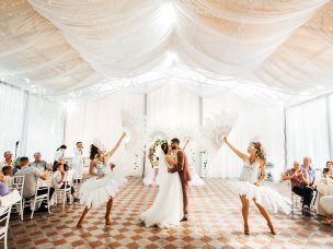 - Подарки от ресторана: на свадьбу - ежегодный сертификат со 100% скидкой на номерной фонд на годовщину свадьбы, номер молодоженам в подарок, скидка 20% на номера для гостей, 30% на дегустацию свадебного меню, оформление горки шампанского